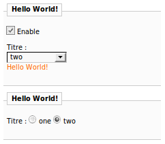<fieldset> <legend><?php echo(__('Hello World!')); ?></legend> <p><label class="classic"><?php echo( form::checkbox('example_active','1',$settings->example_active). ' '.__('Enable')); ?></label></p> <p><label><?php echo(__('Title:'). form::combo('combo',$combo_values,'2')); ?> </label></p> <p class="form-note"> <?php echo(__('Hello World!')); ?> </fieldset> <fieldset> <legend><?php echo(__('Hello World!')); ?></legend> <p> <?php echo __('Title:'); ?> <label class="classic"><?php echo( form::radio(array('radio'),html::escapeHTML('1'),false). __('one')); ?></label> <label class="classic"><?php echo( form::radio(array('radio'),html::escapeHTML('2'),true). __('two')); ?></label> </p> </fieldset>
