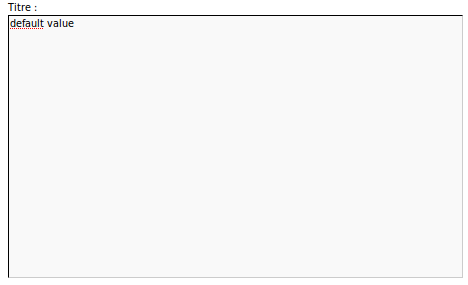 <p class="area"><label><?php echo(__('Title:'). form::textarea('textarea',80,20, __('default value'))); ?></label></p>